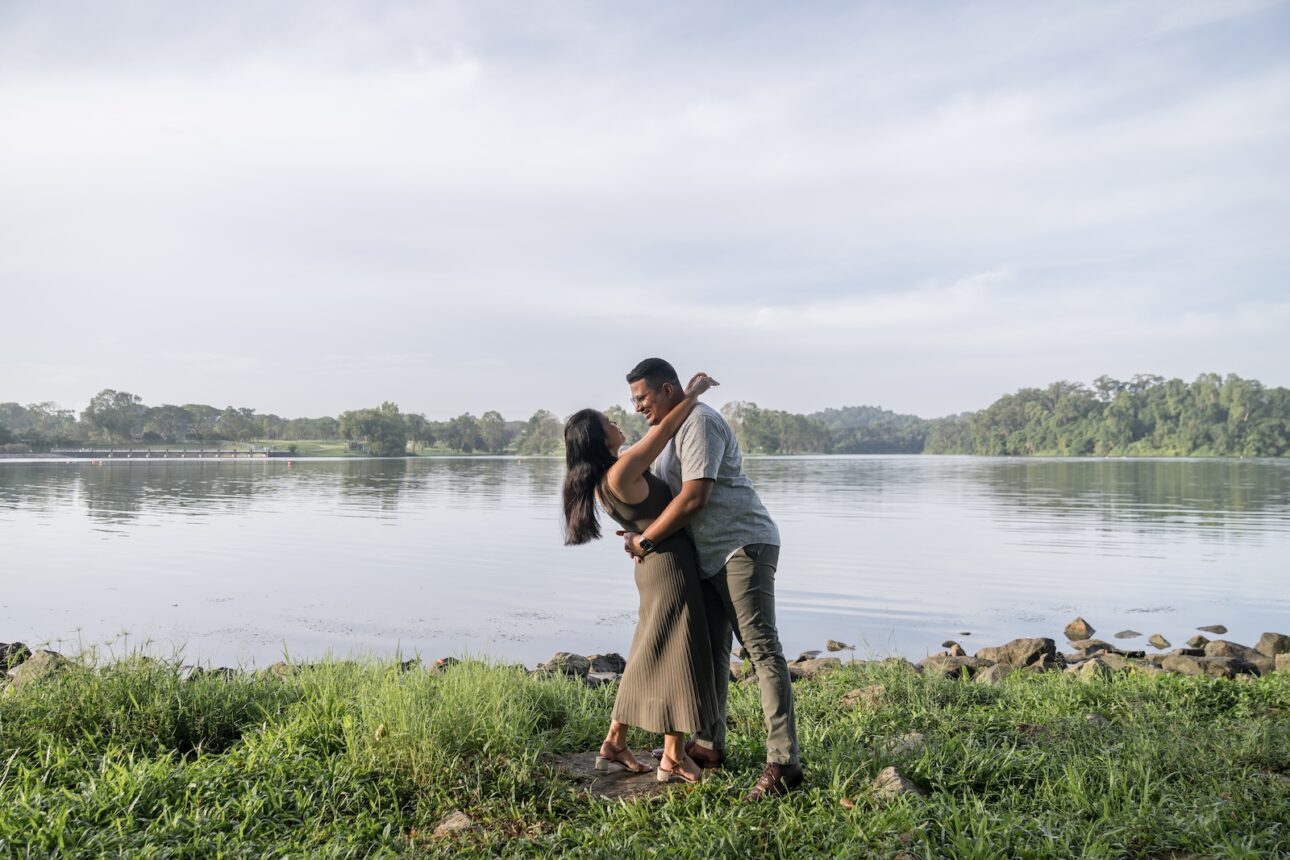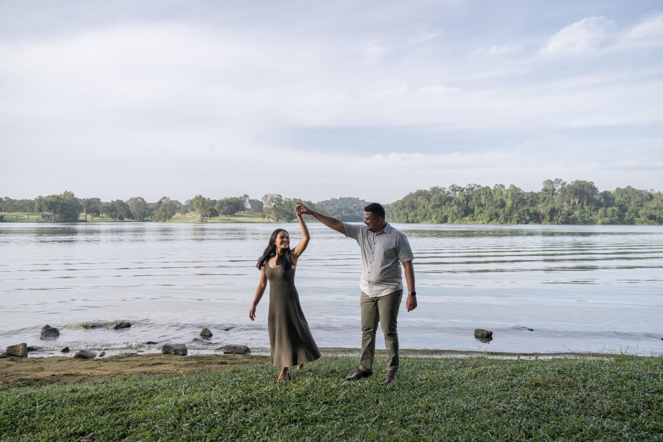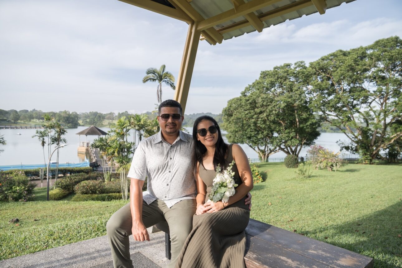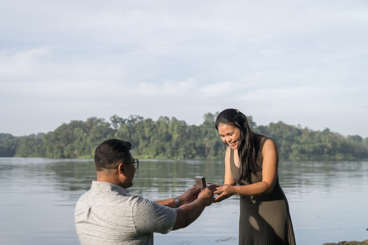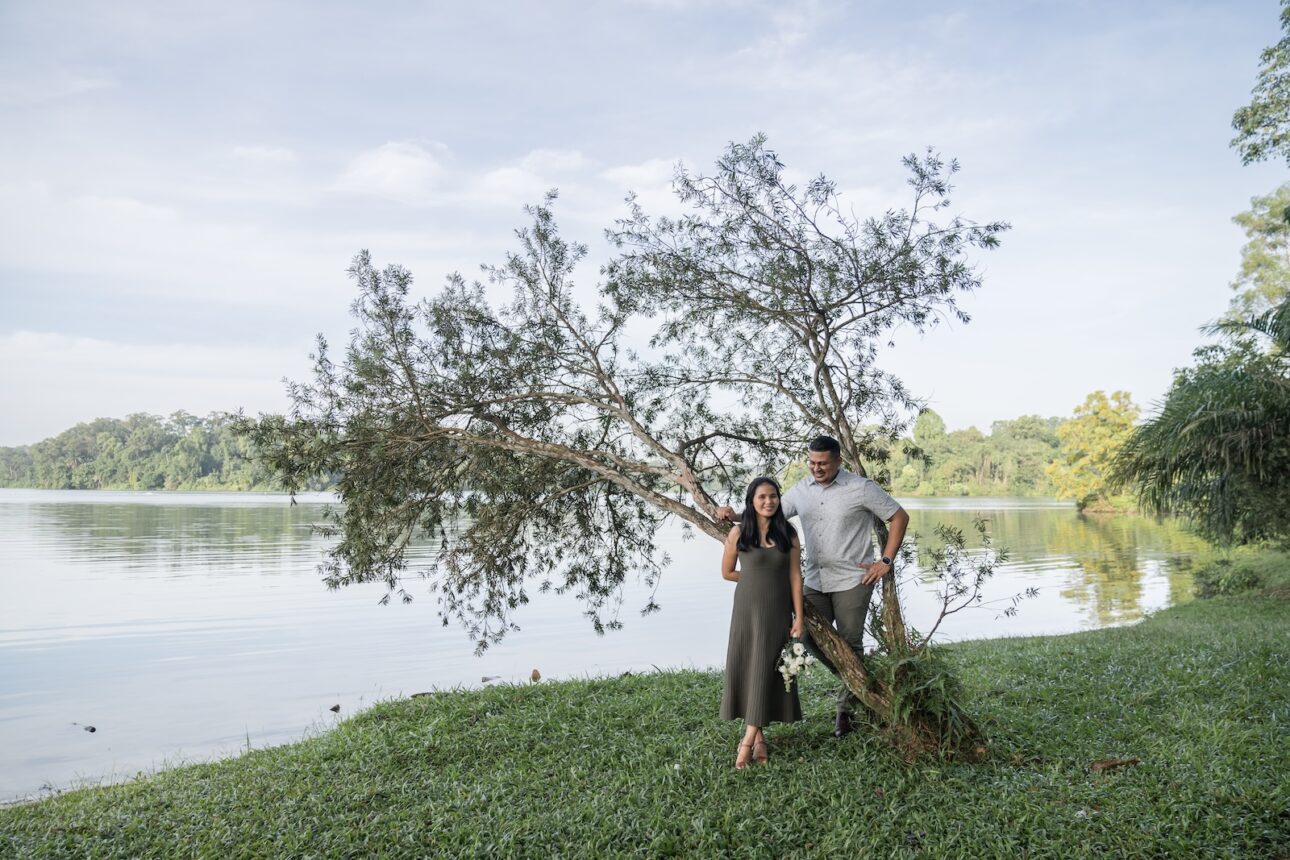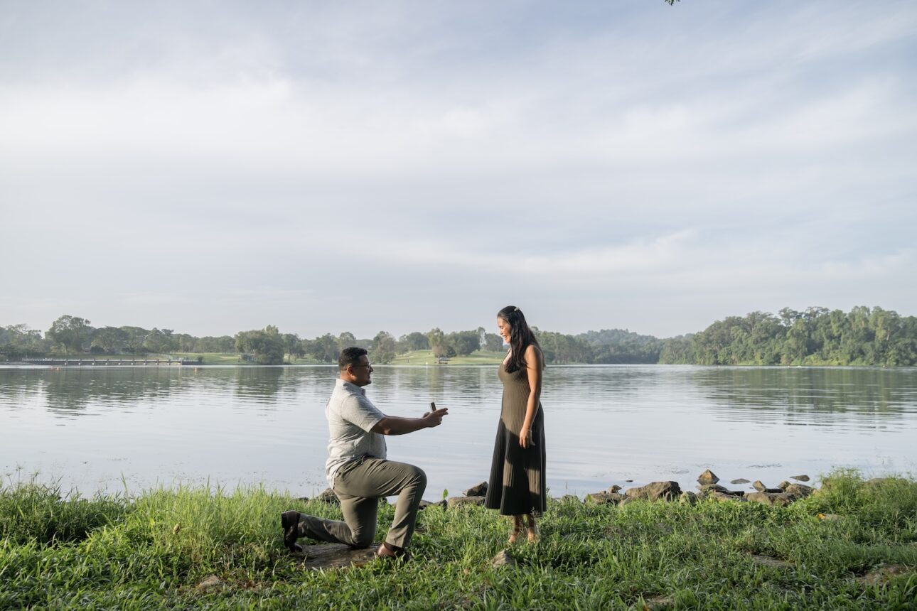 Anton knew Eva loves nature, so he wanted a proposal in one of Singapore’s parks in the early morning, before the hot sun melts everyone. We sneaked in a few exchanges to plan the location, flowers, date and time out without Eva knowing, and Anton had the photoshoot itself as a cover story. We were just headed out for a normal couple photoshoot, of course! Nothing fancy.